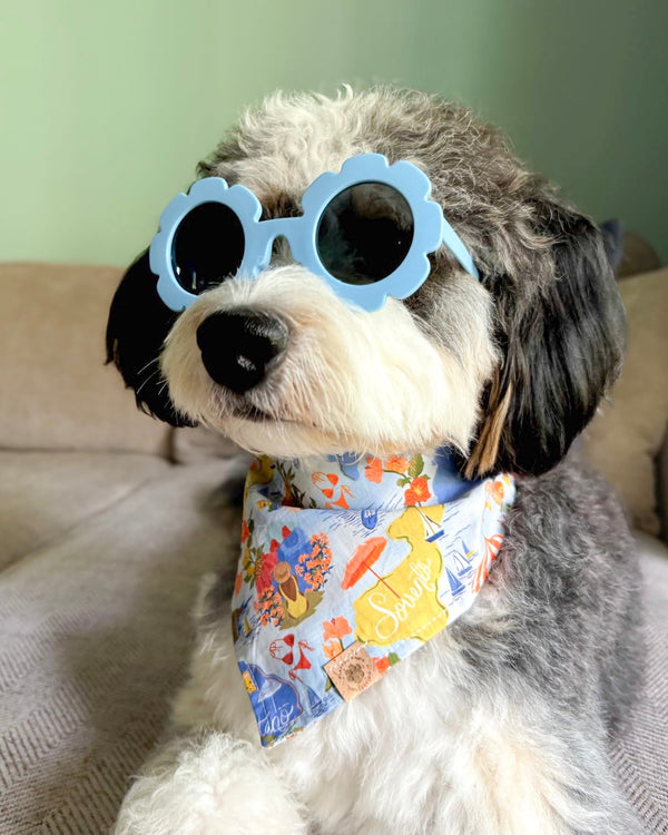 • Our Divina Costiera bandana is a fun and neutral print for summer and your next Italian getaway! Features beach scenes of the Amalfi Coast on a light blue background.