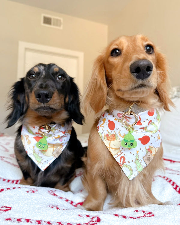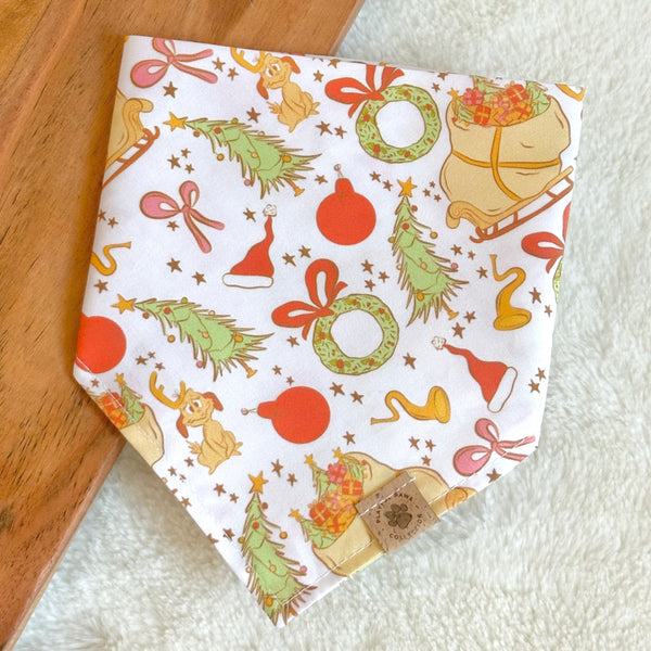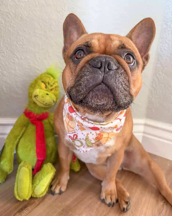 • Our Grinchmas Wholiday bandana is a fun and cute print for the holiday season! Features a sleigh full of presents, a dog, and classic Christmas icons on a white background.