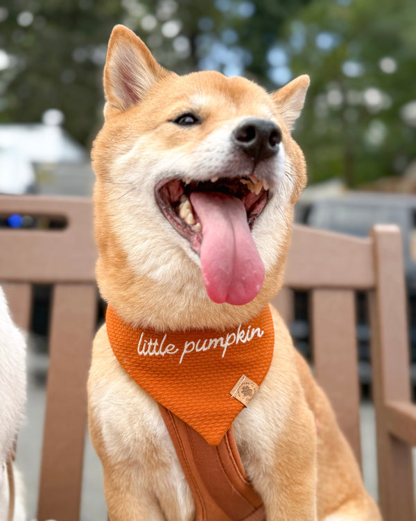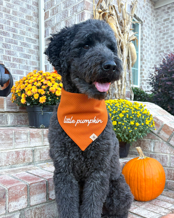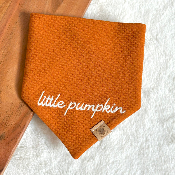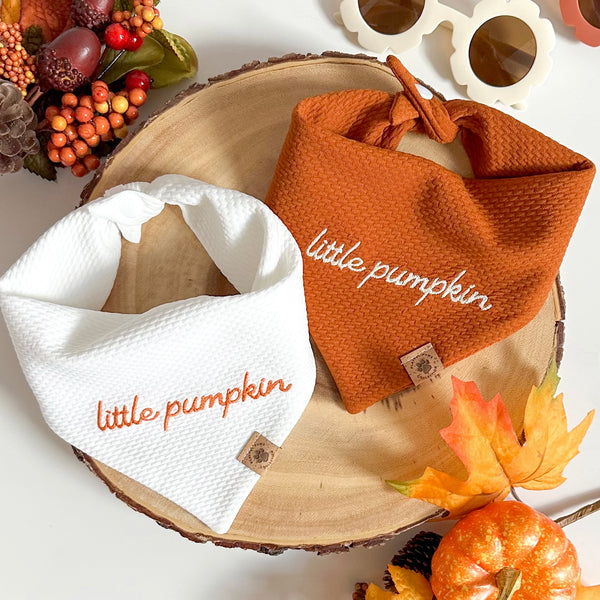 - Our Little Pumpkin Embroidered Knit bandana is a cute and neutral print for the fall season! Features a burnt orange bullet knit fabric with "little pumpkin" embroidered with ivory thread.