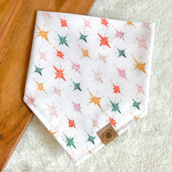 - Our Starbursts bandana is a cute and neutral print for the holiday season and NYE! Features festive starbursts in red, green, yellow, and pink on a white background. Perfect for any celebratory occasion.