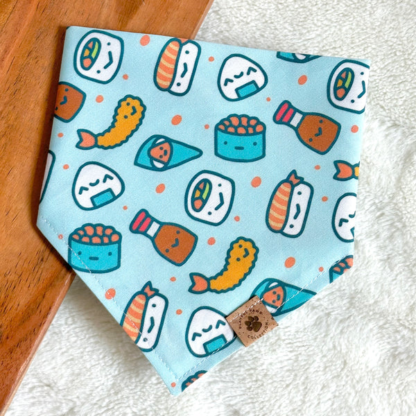• Our Tempurrra Deluxe bandana is a fun and cute print to celebrate AAPI month and for every day wear! Features various sushi rolls, soy sauce, and shrimp tempura with cute smiley faces on a blue background.