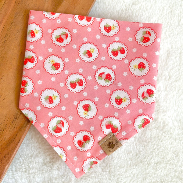 - Our Strawberry Jam bandana is a fun and cute print for spring and every day wear! Features strawberries in a red scalloped design with white flowers on a pink background.
