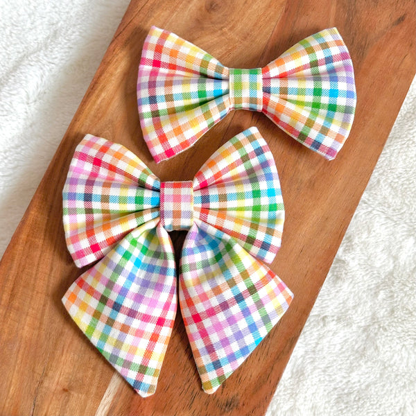 - Our Rainbow Gingham bow comes with a cotton fabric and stabilizer for that extra plush & to hold their shape on all of your pup’s adventures!