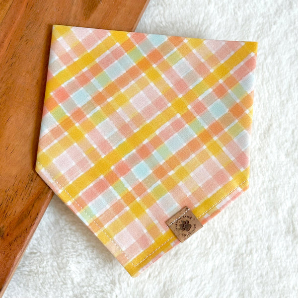 - Our Amber Plaid bandana is a cute and neutral print for fall and every day wear! Features a yellow, orange, pink, and sky blue plaid pattern.