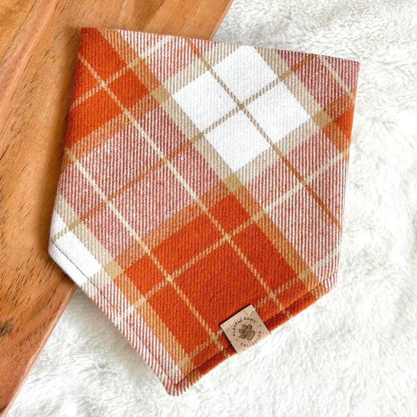 - Our Cinnamon Orange Plaid Flannel bandana is a cute and neutral print for fall and every day wear! Features a classic white and various shades of orange plaid. It's great worn on by itself or you can personalize it with a letter patch. See our 'Add-ons' page.