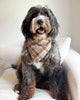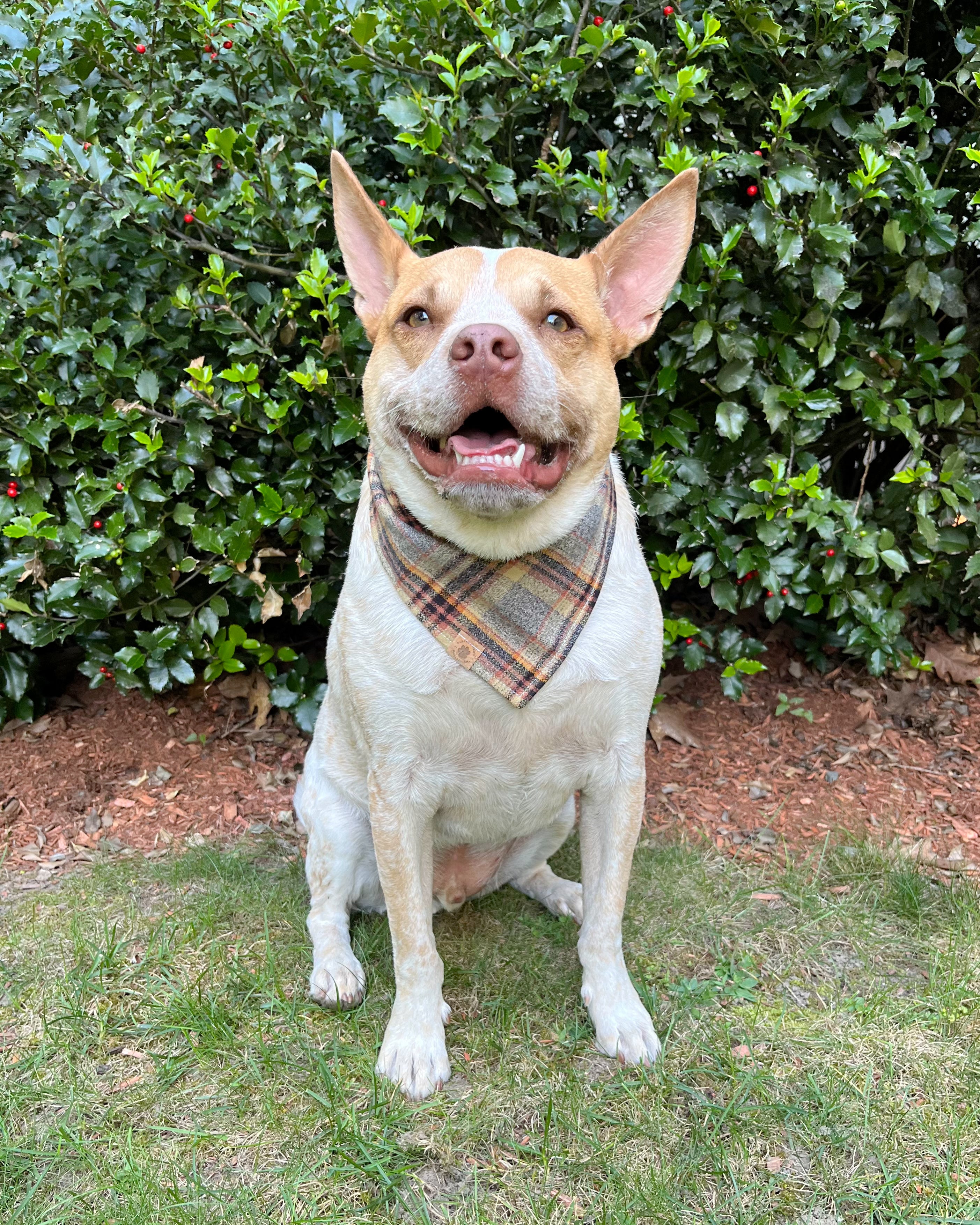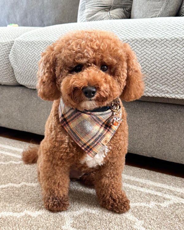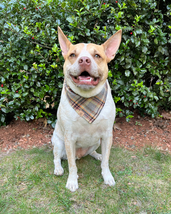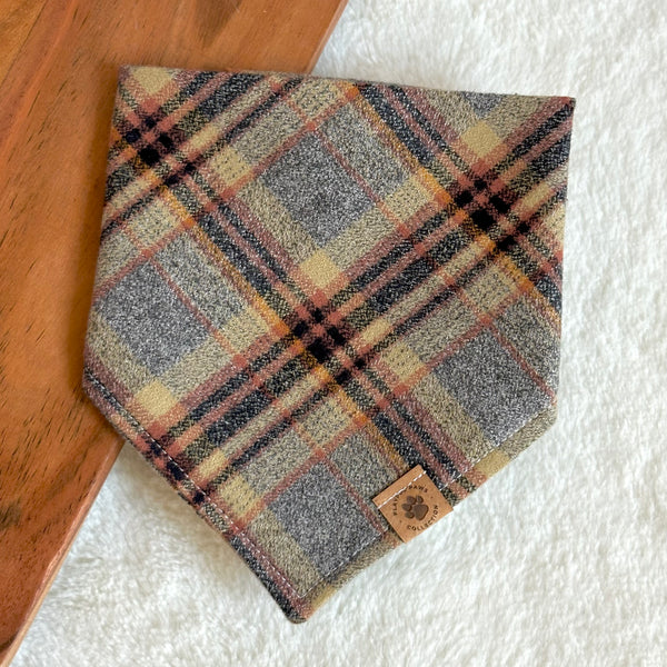 - Our Fireside Plaid Flannel bandana is a cute and neutral print for the fall season! Features a medium-weight flannel fabric with a brown, tan, yellow, and grey plaid. It's great worn on by itself or you can personalize it with a letter patch. See our 'Add-ons' page.