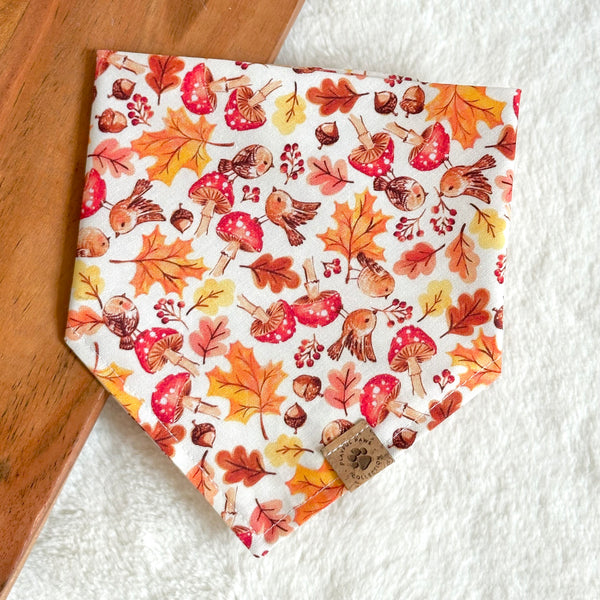 - Our Foragers Forest bandana is a cute and neutral print for the fall season! Features various fall leaves, red mushrooms, and brown songbirds on an off-white background.