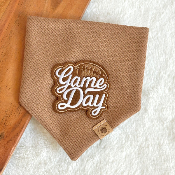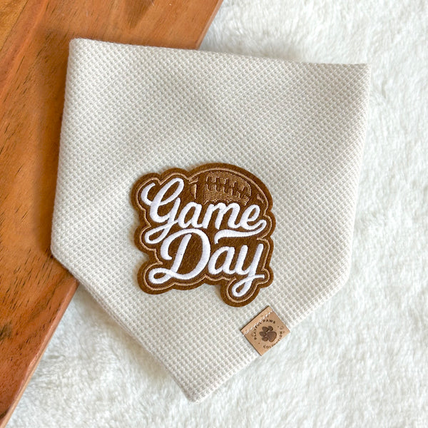 - Our Game Day bandana is a fun and neutral print to celebrate football sunday. Features a football game day patch (approx. 3" W x 2.75" H) on a mocha or ivory waffle knit fabric of choice.