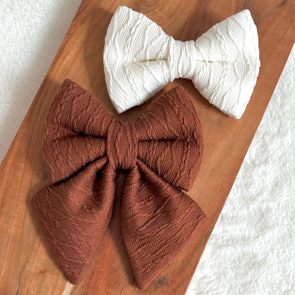 - Our Hazelnut and Light Cream Cable Knit bow comes with a lining fabric and stabilizer for that extra plush & to hold their shape on all of your pup’s adventures!