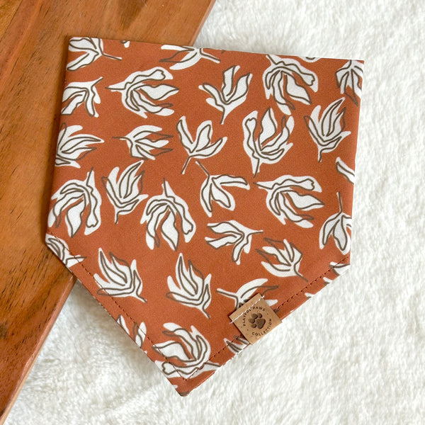 - Our Sedona bandana is a cute and neutral print for the fall season! Features abstract leaves in white and black on a brown background.
