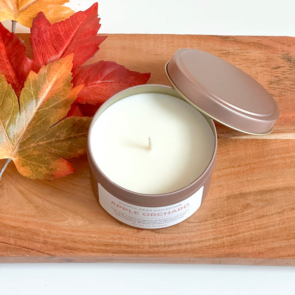 - Pet-friendly soy scented candle in a frosted rose gold tin container