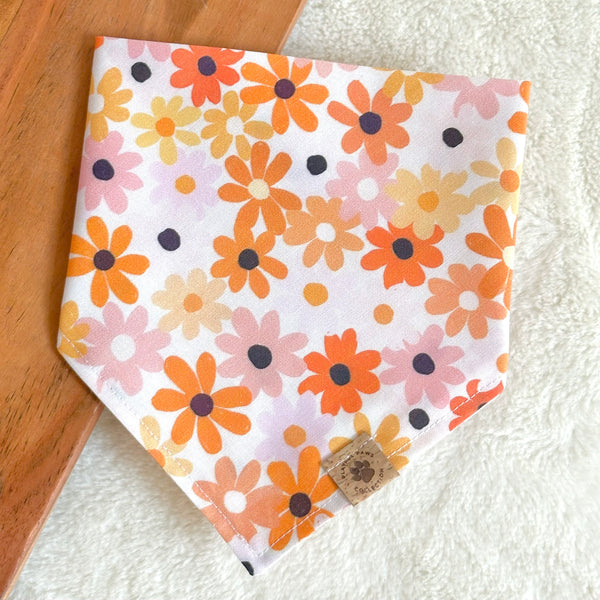 - Our Enchanted Blooms bandana is a cute and neutral print for this spooky season and every day wear! Features various pink and orange florals on a white background.