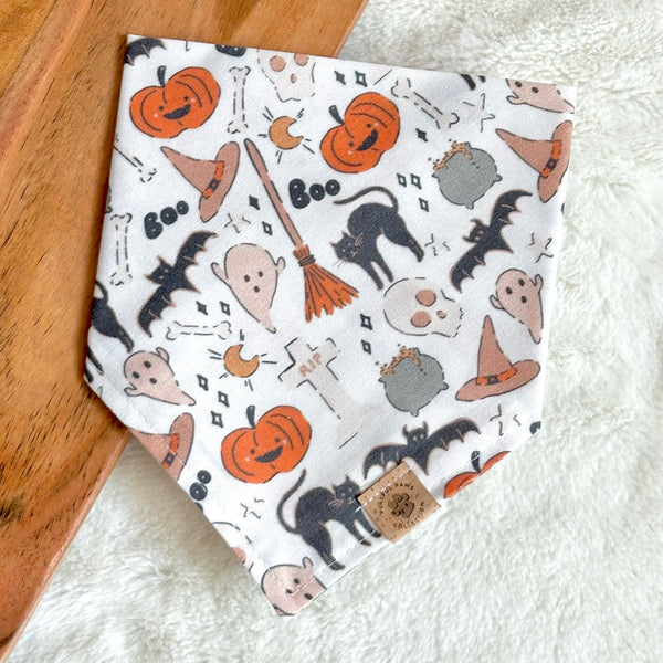 - Our Halloween Night bandana is a cute and neutral print for Halloween! Features iconic spooky symbols such as jack-o-lanterns, bats, ghosts, black cats, and cauldron on an off-white background.