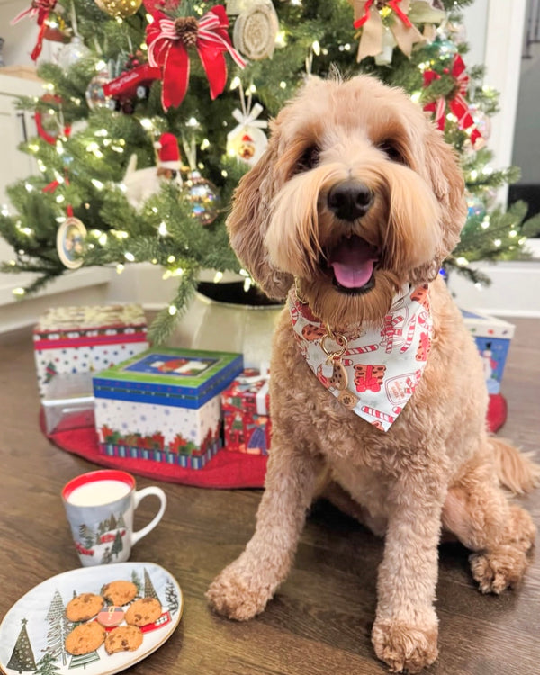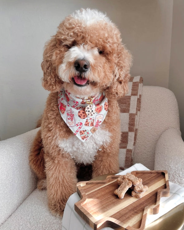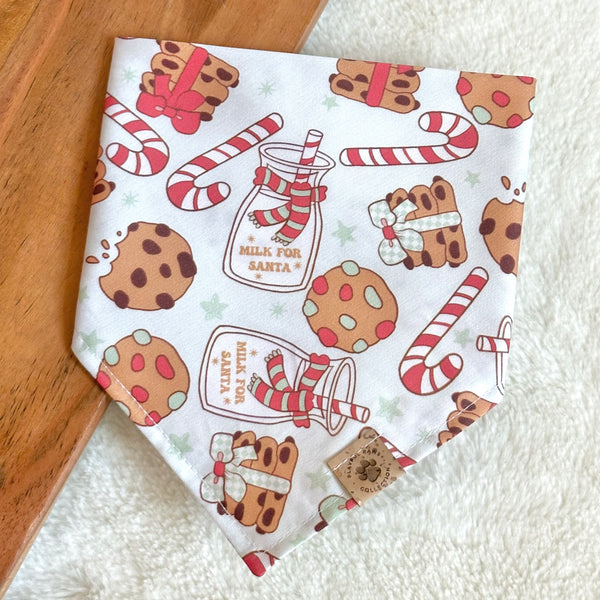 - Our Cookies for Santa bandana is a fun and cute print for the holiday season! Features glasses of milk, chocolate chip cookies, and green stars on a light mint background.