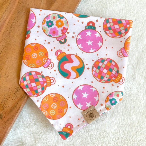 - Our Disco Ornaments bandana is a fun and cute print for the holiday season! Features retro disco ball, peace sign, and star ornaments on a light cream background.