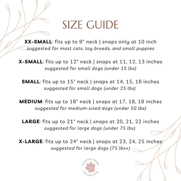 Please measure your pet’s neck circumference using a soft measuring tape before purchasing to ensure the most accurate sizing. If your pet is in between sizes or they are extra fluffy, we recommend sizing up! For breed suggestions, see examples below: