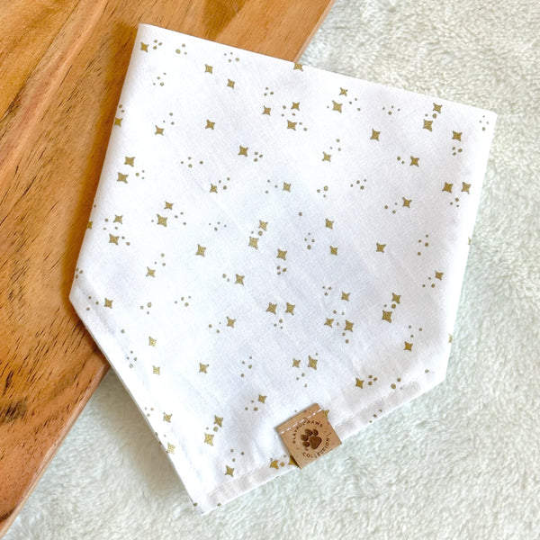 - Our Star Confetti bandana features gold metallic accents on a white fabric. Super versatile and can be worn for any celebratory occasion.