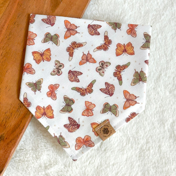 • Our Chasing Butterflies bandana is a cute and neutral print for fall and every day wear! Features various butterflies in orange, pink, green, and brown on a beige background.