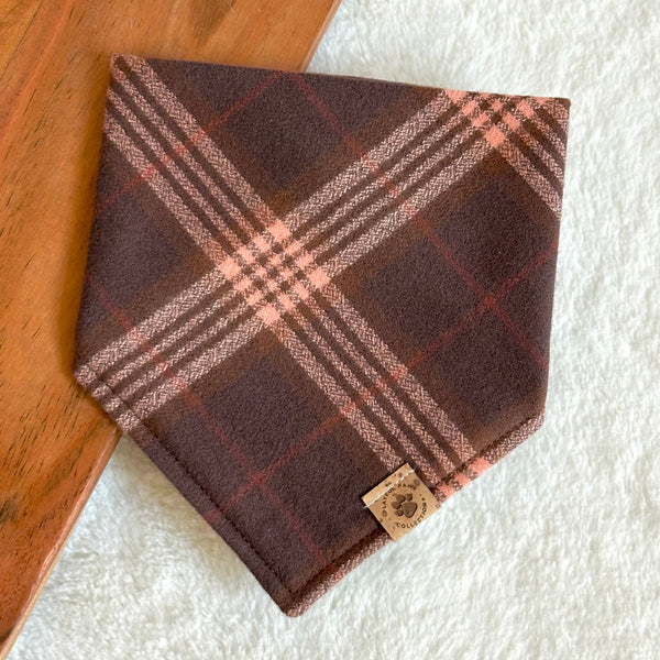 • Our Chocolate Plaid Flannel bandana is a cute and neutral print for the fall season! Features a medium-weight flannel fabric with a combination of deep and warm browns, terracotta, and peach. It's great worn on by itself or you can personalize it with a letter patch. See our 'Add-ons' page.
