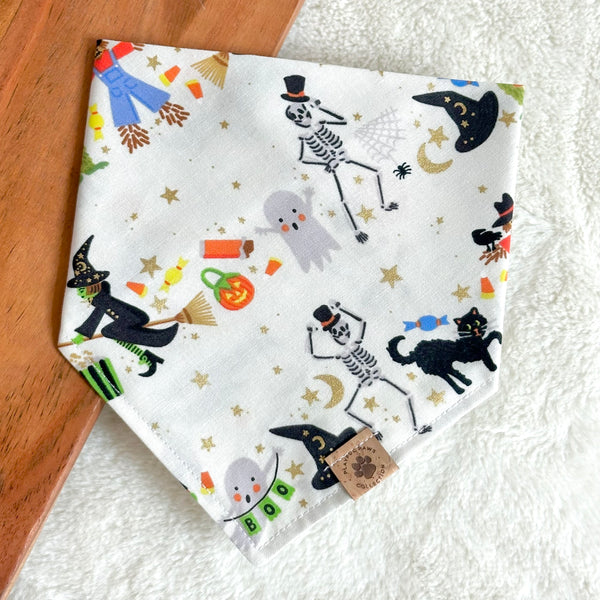 - Our Halloween Parade bandana is a cute and neutral print for Halloween and this spooky season! Features Halloween-themed characters like witches, ghosts, skeletons, and monsters on an off white background with gold metalllic acents.