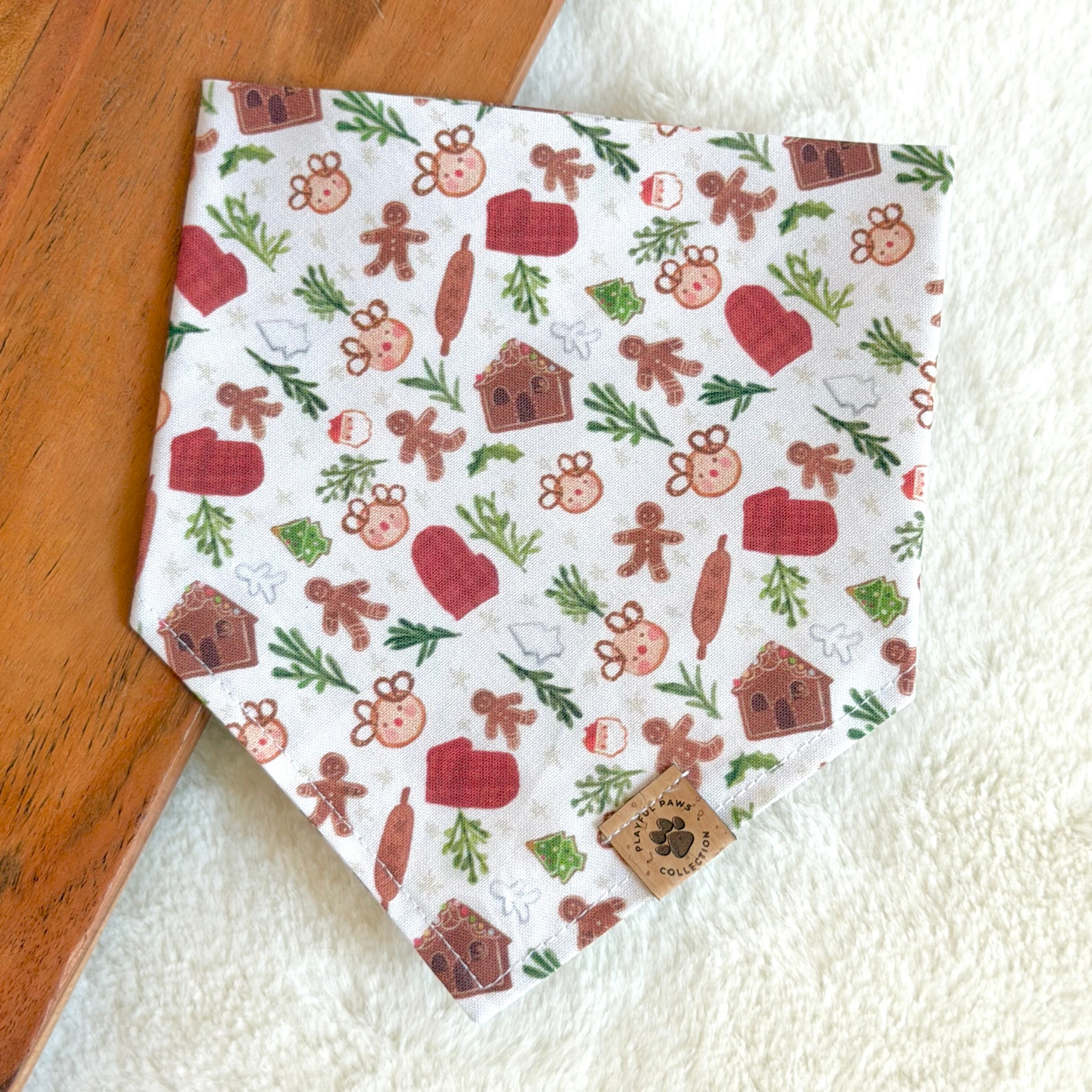 • Our Holiday Baking bandana is a cute and neutral print for the holiday season! Features gingerbread man and houses, christmas cookies, rolling pins, oven mitts, and so much more on an off-white background.