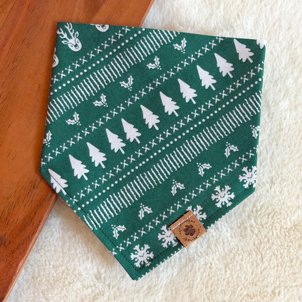 • Our Jinglewood Fair Isle bandana is a cute and neutral print for the holiday season! Features reindeers, snowflakes, trees, and mistletoes in white on a green background.