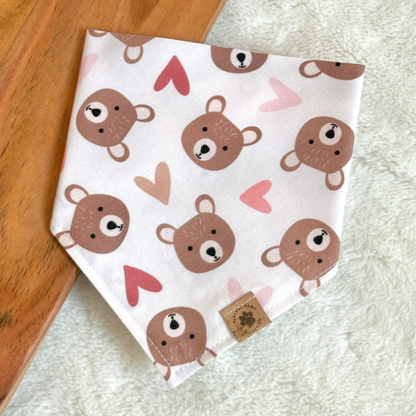 - Our Bear Hugs bandana is a cute and neutral print for Valentine's Day and everyday wear! Features teddy bear faces with various red, pink, and tan hearts on a cream background.