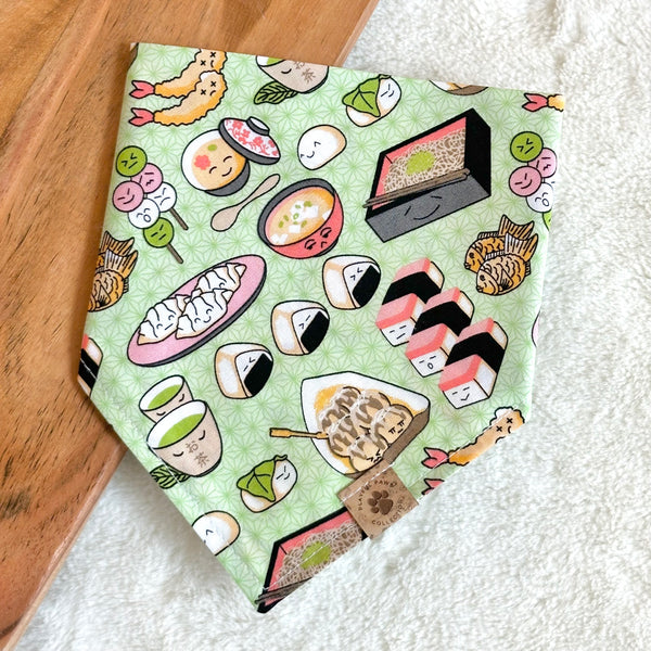 - Our Bento Buddies bandana is a cute and fun print to celebrate AAPI month and for every day wear! Features various Japanese cuisines on a light green background.