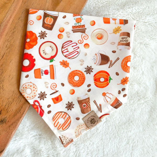 - Our Fall Junkie bandana is a cute and fun print for this fall season! Features delightful fall drinks and donuts from pumpkin spice to apple cider on a cream background.