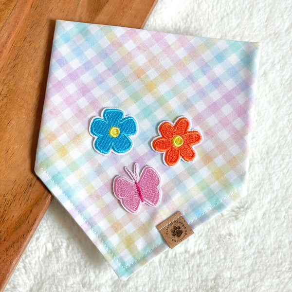 - Our Gingham Garden bandana is a fun and cute print for spring and every day wear! Features a pastel gingham fabric that you can personalized with three spring patches (approx. 1.4" x 1.4" each). Leave a comment below on which patches you would like to add to your bandana.