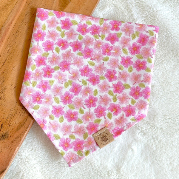 • Our Hibiscus Paradise bandana is a fun and cute print for summer and everyday wear! Features pink hibiscus flowers on an off-white background.