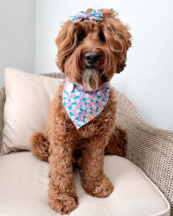 - Our Hibiscus Paradise bandana is a fun and cute print for summer and everyday wear! Features pink hibiscus flowers on a dark teal background.