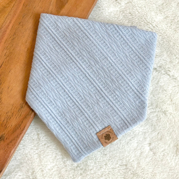 - Our Light Blue Cable Knit bandana is a cute and neutral print for every day wear! Personalize it with one of our patches. See our 'Add-ons' page.