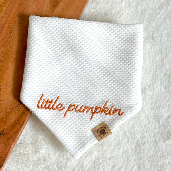 - Our Little Pumpkin Embroidered Knit bandana is a cute and neutral print for the fall season! Features an ivory bullet knit fabric with "little pumpkin" embroidered with rust orange thread.