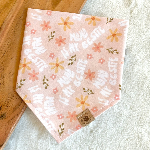 • Our Mama is My Bestie bandana is a cute and fun print for Mother's Day and everyday wear! Features a groovy font and florals on a light pink background.