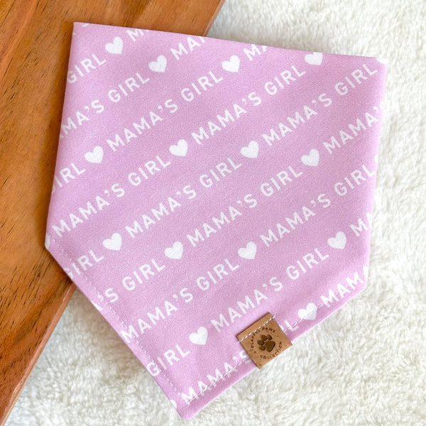 • Our Mama's Girl bandana is a cute and neutral print for Mother's Day and every day wear! Features the phrase "mama's girl" and white hearts on a pink-purple background.