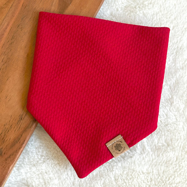 - Our Red double knit bandana is a cute and neutral print for the holiday season! Features a lightweight crepe-like fabric with a riveted texture. Personalize it with a holiday or letter patch. See our 'Add-ons' page.