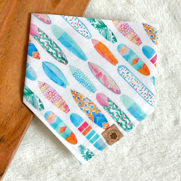 - Our Surf's Up bandana is a cute and neutral print for summer and every day wear! Features various blue, pink, and orange surfboards on a white background.