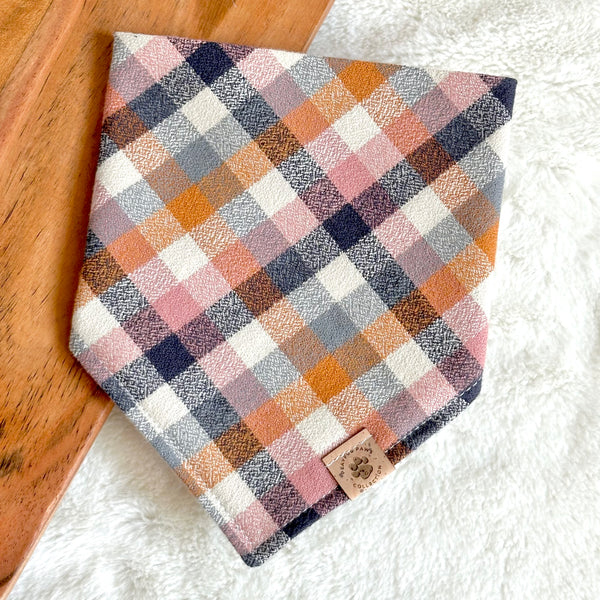 - Our Sweater Weather Checkered Flannel bandana is a cute and neutral print for fall and everyday wear! Features a pink, orange, blue, grey, and cream checkered plaid.