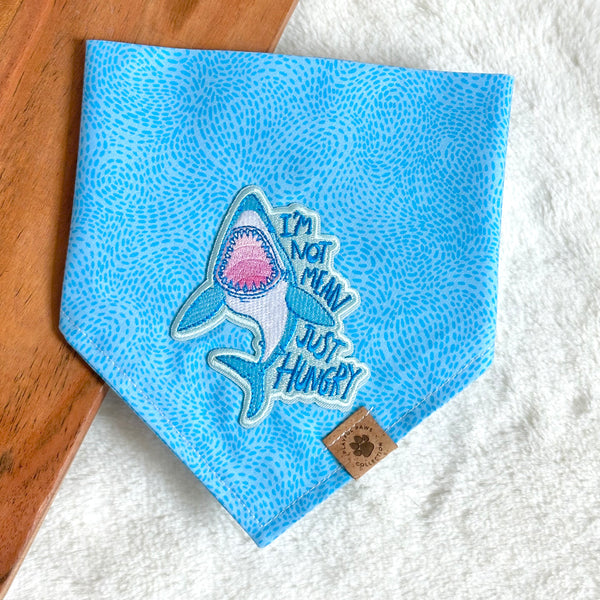 - Our Just a Hungry Shark bandana is a fun and cute print for summer and every day wear! Features an embroidered shark patch (approx. 2.75" x 3.25") on a blue waves background.