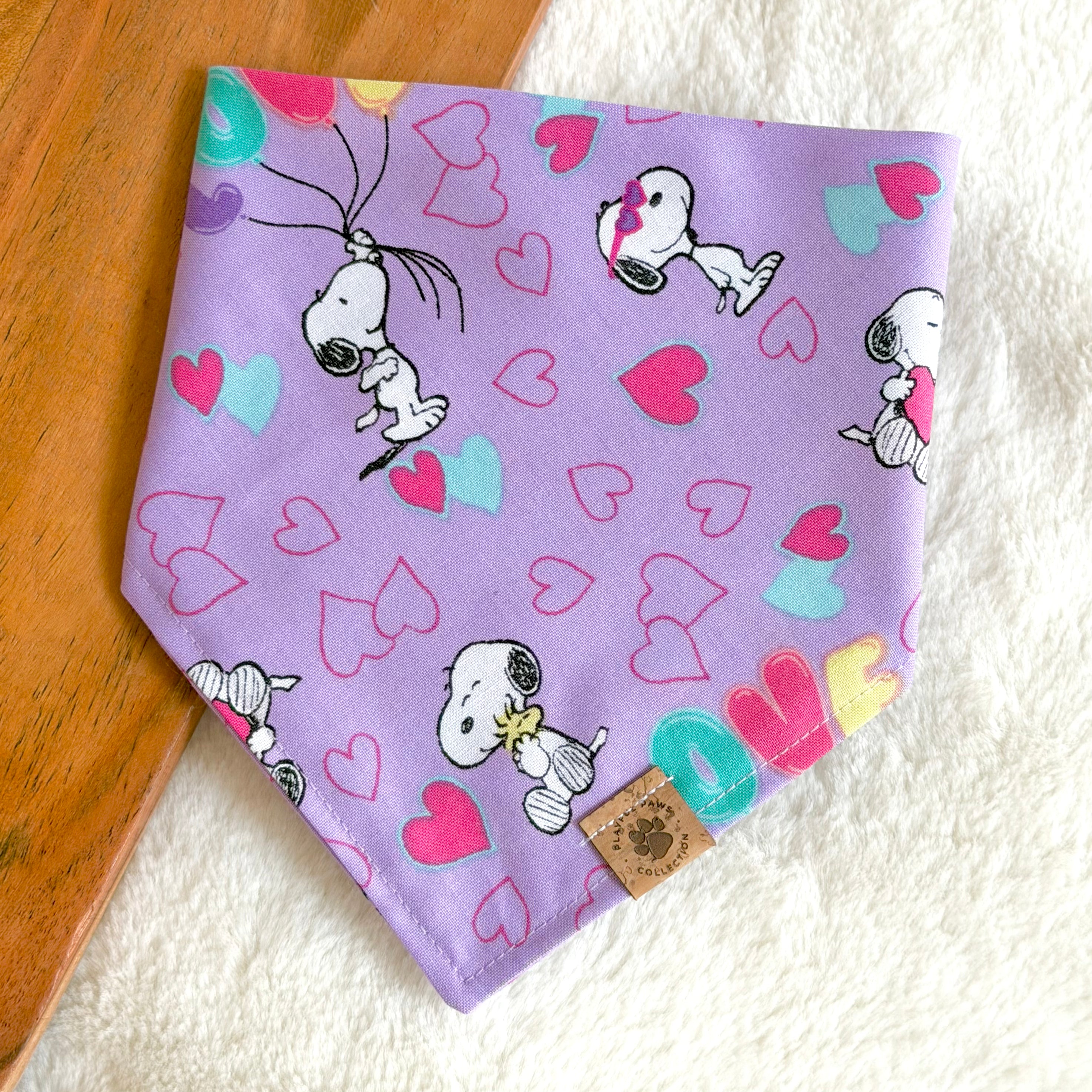 - Our Love, Snoopy bandana is a cute and neutral print for Valentine's Day! Features Snoopy, Woodstock, LOVE balloons, and hearts on a purple background.