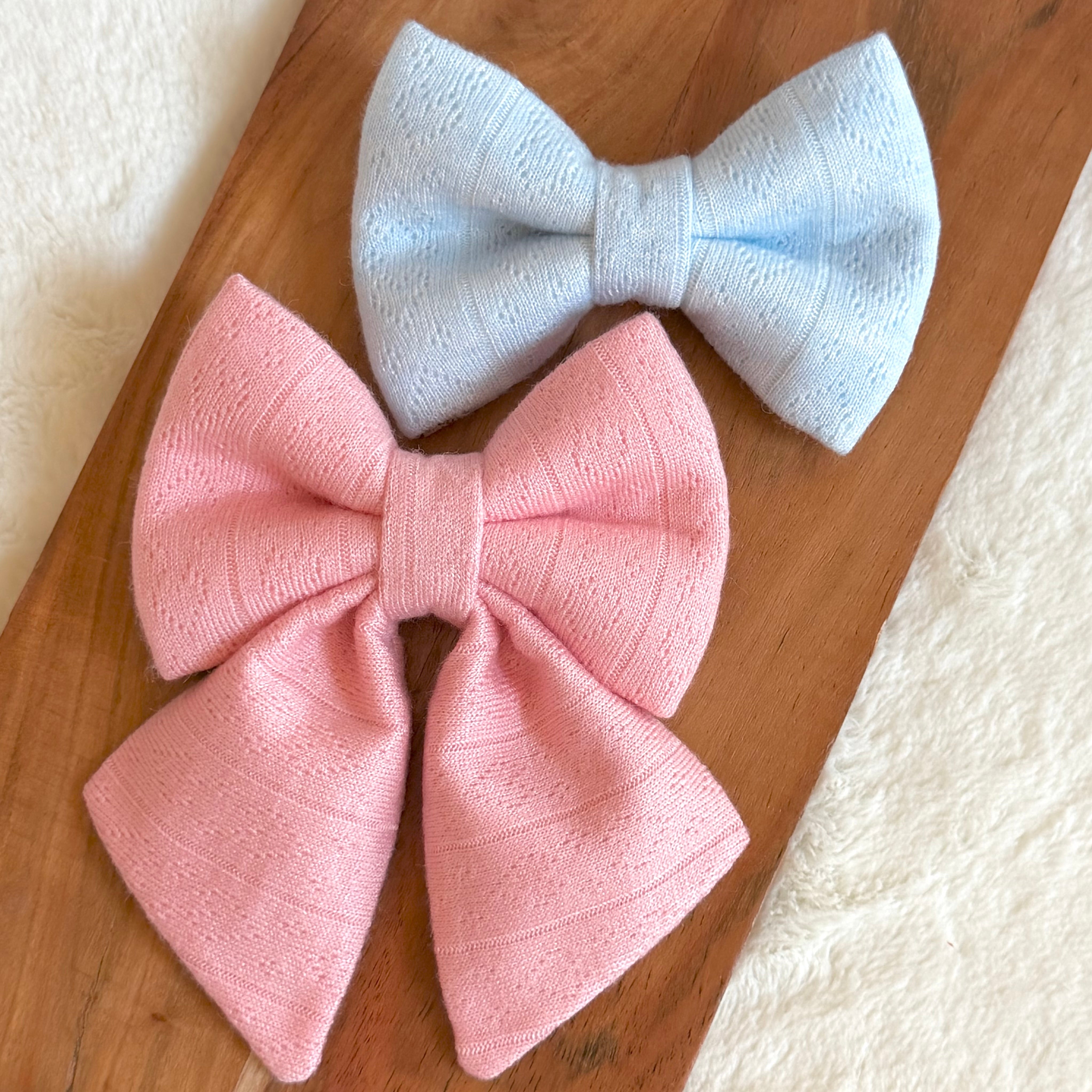 - Our Pink and Blue Hearts Pointelle Knit bow comes with a lining fabric and stabilizer for that extra plush & to hold their shape on all of your pup’s adventures!