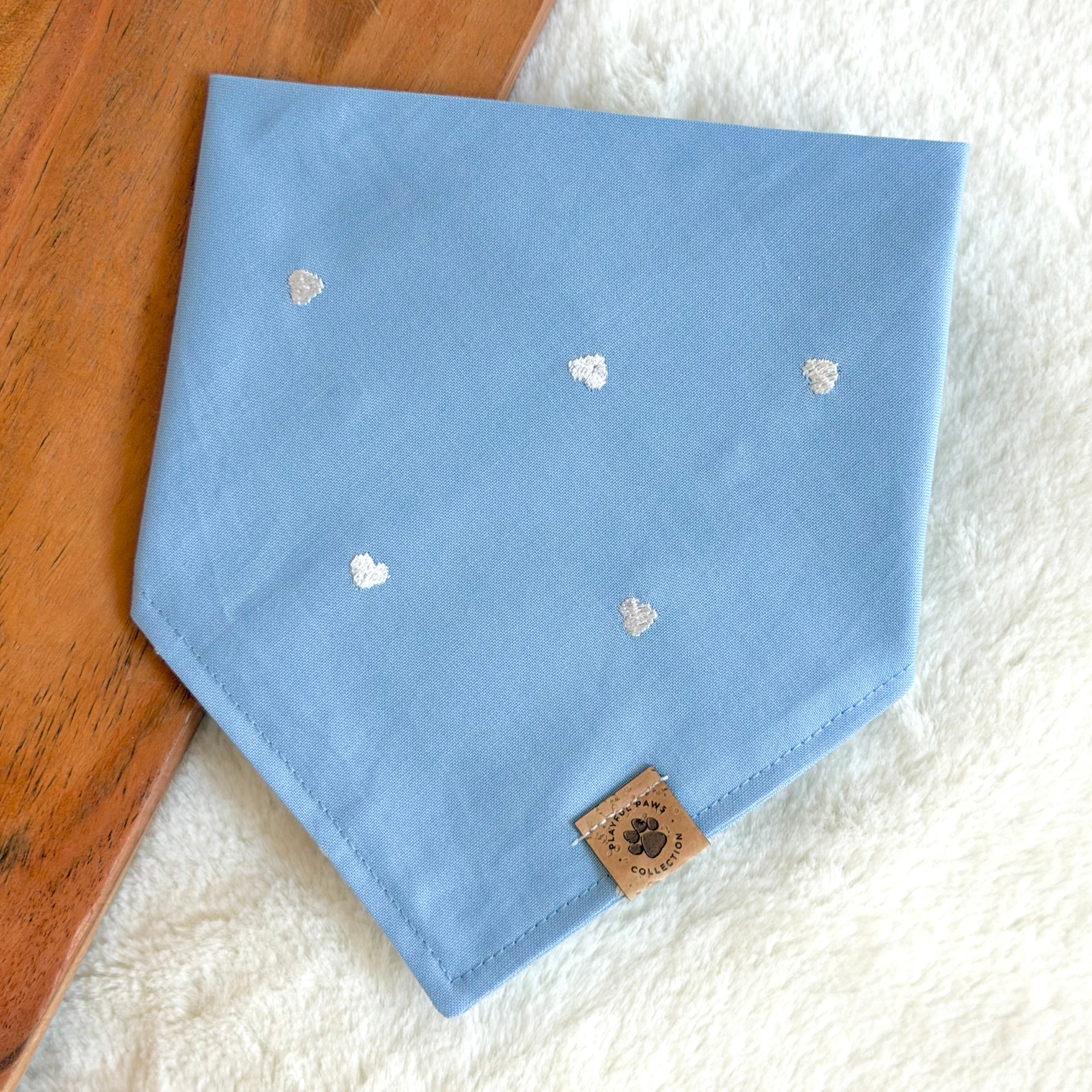 - Our Sky Full of Hearts bandana is a cute and neutral print for every day wear! Features white embroidered hearts on a light blue chambray-like fabric.