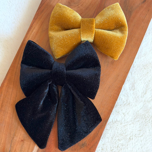 - Our Black and Gold Glitter Velvet bow comes with a lining fabric and stabilizer for that extra plush & to hold their shape on all of your pup’s adventures!
