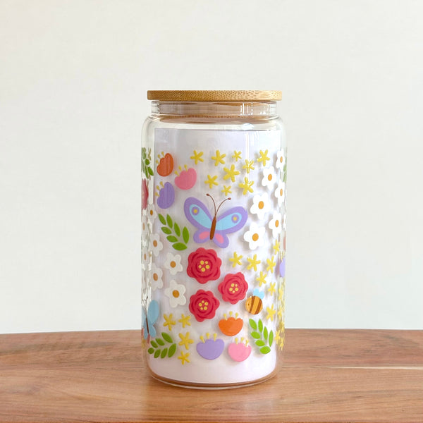 - Enjoy your springtime drinking experience with our Happy Spring Garden glass cup because every sip should bloom with happiness! Features a 16 oz glass cup with a double-sided UV DTF decal of colorful spring elements (butterflies, bees, florals, and green foliage).