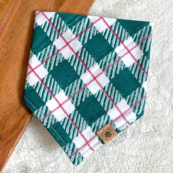 - Our Let's Get Cozy flannel bandana is a cute and neutral print for the holiday season! Features a dark blue green and white plaid with streaks of pink. Personalize it with a letter patch. See our 'Add-ons' page.